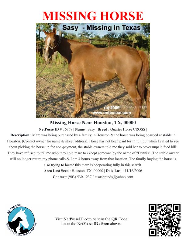 Description: Mare was being purchased by a family in Houston & the horse was being boarded at stable in Houston. (Contact owner for name & street address). Horse has not been paid for in full but when I called to see about picking the horse up for non-payment, the stable owners told me they sold her to cover unpaid feed bill. They have refused to tell me who they sold mare to except someone by the name of "Dennis". The stable owner will no longer return my phone calls & I am 4 hours away from that location. The family buying the horse is also trying to locate this mare is cooperating fully in this search.