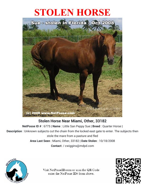 Description: Unknown subjects cut the chain from the locked east gate to enter. The subjects then stole the mare from a pasture and fled