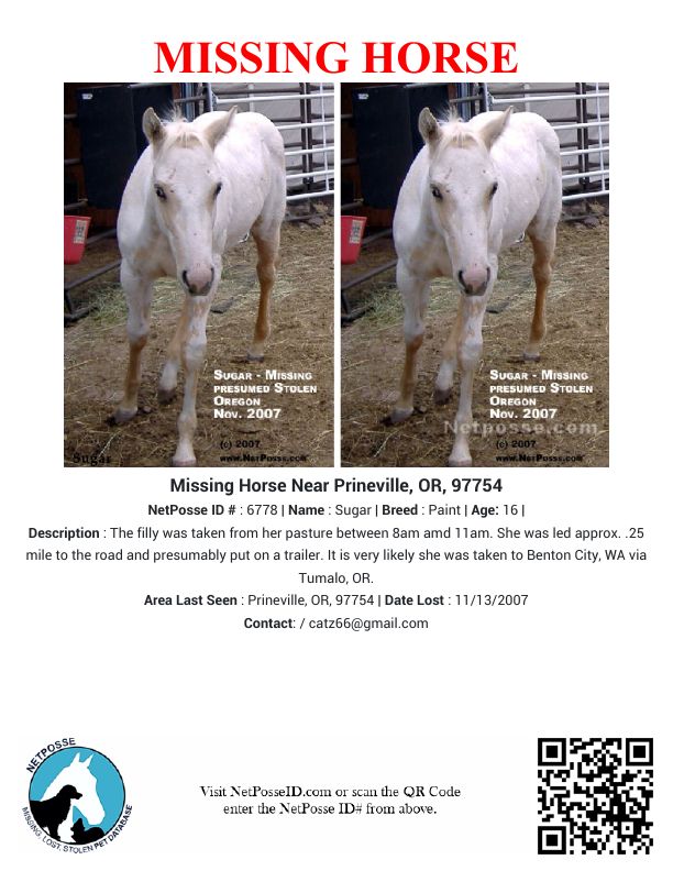 Description: The filly was taken from her pasture between 8am amd 11am. She was led approx. .25 mile to the road and presumably put on a trailer. It is very likely she was taken to Benton City, WA via Tumalo, OR.