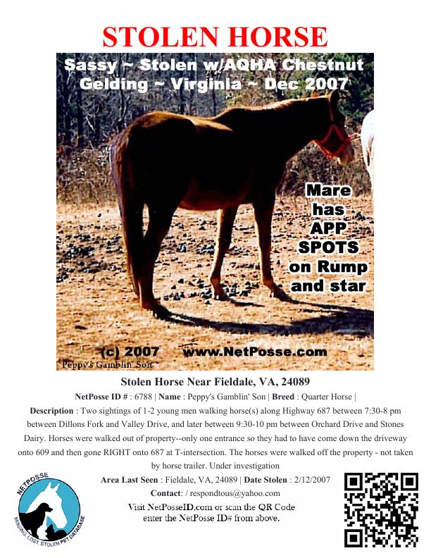 Description: Two sightings of 1-2 young men walking horse(s) along Highway 687 between 7:30-8 pm between Dillons Fork and Valley Drive, and later between 9:30-10 pm between Orchard Drive and Stones Dairy. Horses were walked out of property--only one entrance so they had to have come down the driveway onto 609 and then gone RIGHT onto 687 at T-intersection.