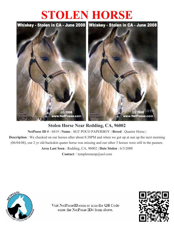 Description: We checked on our horses after about 8:30PM and when we got up at sun up the next morning (06/04/08), our 2 yr old buckskin quater horse was missing and our other 3 horses were still in the pasture.