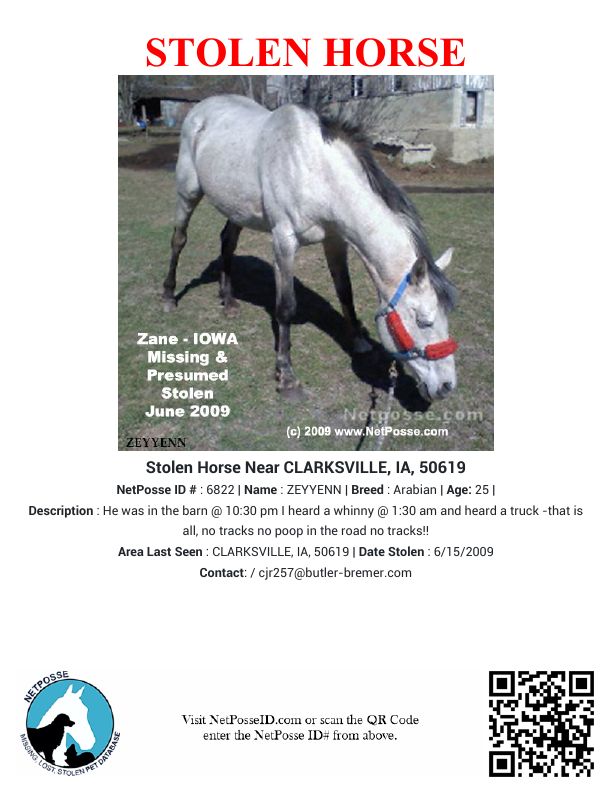 Stolen Horse named ZEYYENN - CLARKSVILLE, IA, 50619 #6822