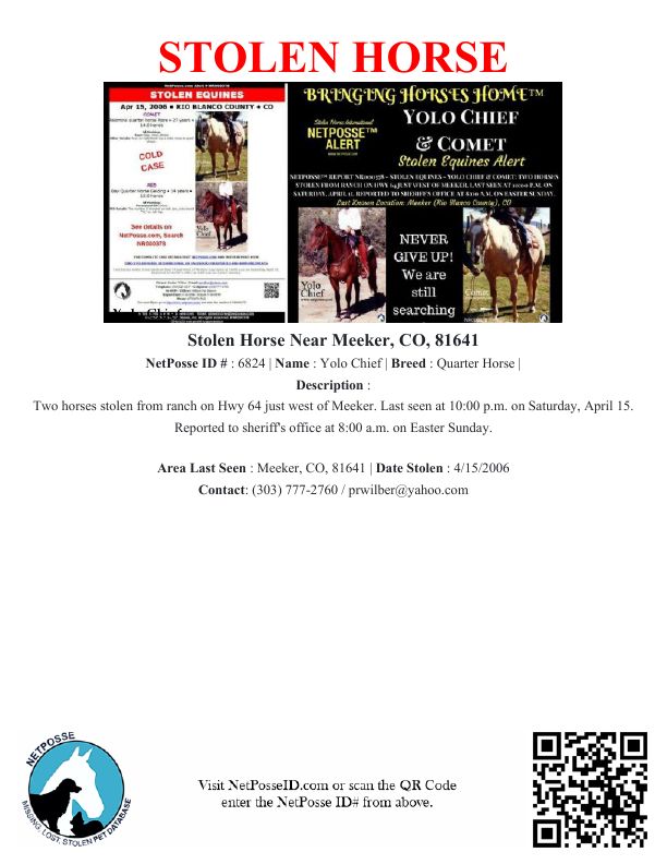 Description: Two horses stolen from ranch on Hwy 64 just west of Meeker. Last seen at 10:00 p.m. on Saturday, April 15. Reported to sheriff's office at 8:00 a.m. on Easter Sunday.