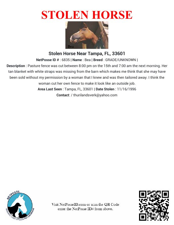 Description: Pasture fence was cut between 8:00 pm on the 15th and 7:00 am the next morning. Her tan blanket with white straps was missing from the barn which makes me think that she may have been sold without my permission by a woman that I knew and was then tailored away. I think the woman cut her own fence to make it look like an outside job.