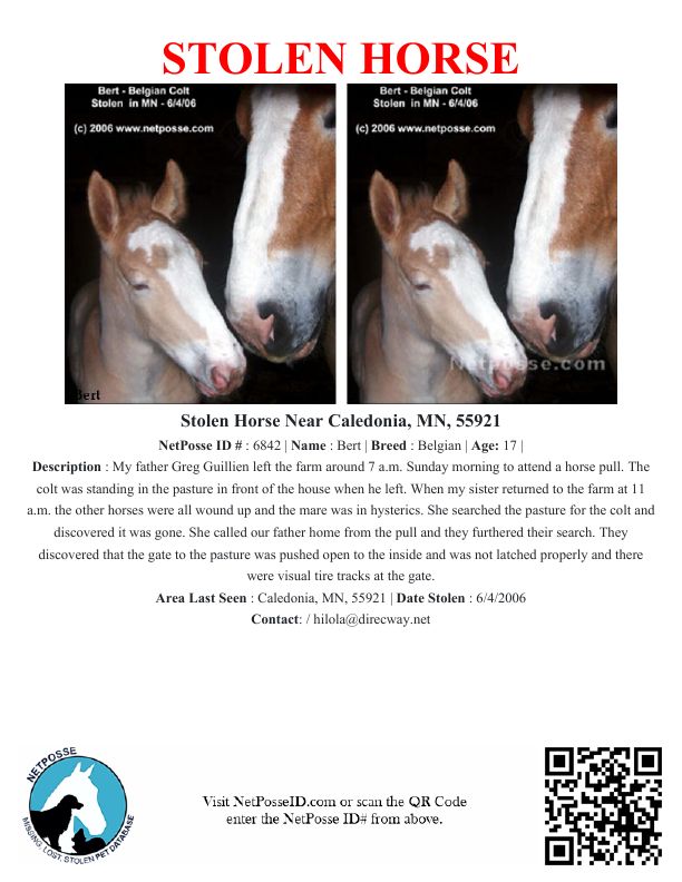 Description: My father Greg Guillien left the farm around 7 a.m. Sunday morning to attend a horse pull. The colt was standing in the pasture in front of the house when he left. When my sister returned to the farm at 11 a.m. the other horses were all wound up and the mare was in hysterics. She searched the pasture for the colt and discovered it was gone. She called our father home from the pull and they furthered their search. They discovered that the gate to the pasture was pushed open to the inside and was not latched properly and there were visual tire tracks at the gate.