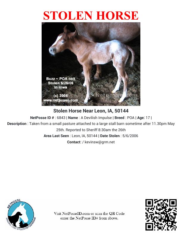 Description: Taken from a small pasture attached to a large stall barn sometime after 11.30pm May 25th. Reported to Sheriff 8:30am the 26th