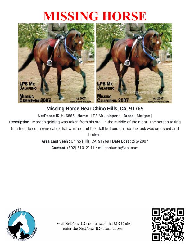 Description: Morgan gelding was taken from his stall in the middle of the night. The person taking him tried to cut a wire cable that was around the stall but couldn't so the lock was smashed and broken.