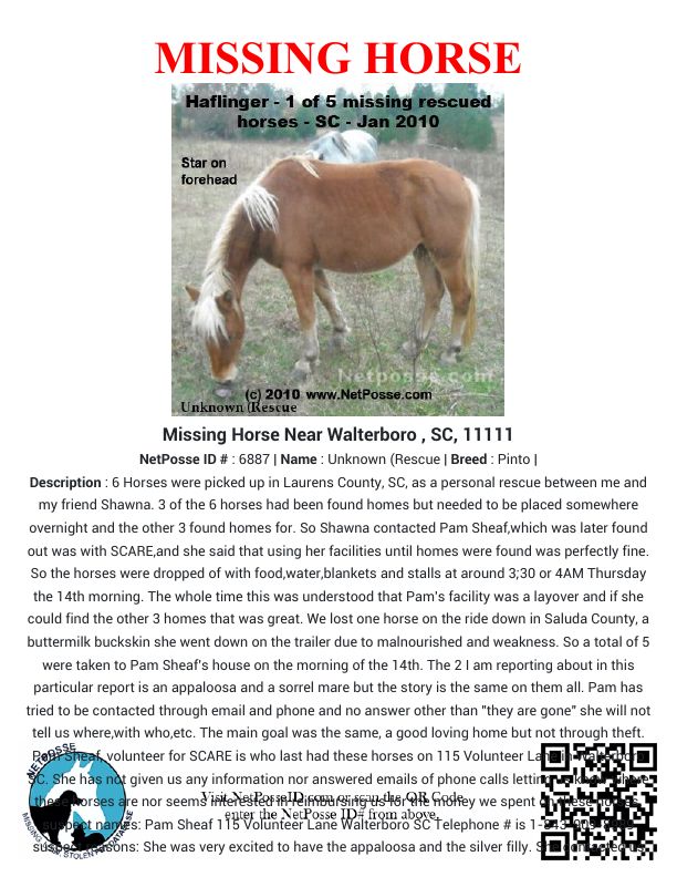 Pam has tried to be contacted through email and phone and no answer other than "they are gone" she will not tell us where,with who,etc. The main goal was the same, a good loving home but not through theft. Pam Sheaf, volunteer for SCARE is who last had these horses on 115 Volunteer Lane in Walterboro SC. She has not given us any information nor answered emails of phone calls letting us know where these horses are nor seems interested in reimbursing us for the money we spent on these horses.