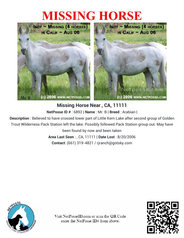 Description: Believed to have crossed lower part of Little Kern Lake after second group of Golden Trout Wilderness Pack Station left the lake. Possibly followed Pack Station group out. May have been found by now and been taken