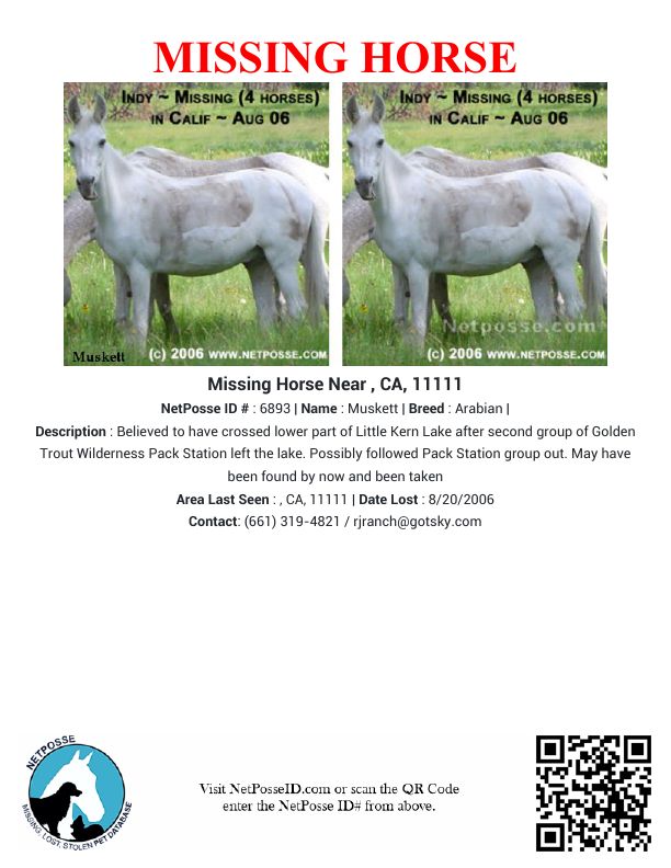 Description: Believed to have crossed lower part of Little Kern Lake after second group of Golden Trout Wilderness Pack Station left the lake. Possibly followed Pack Station group out. May have been found by now and been taken