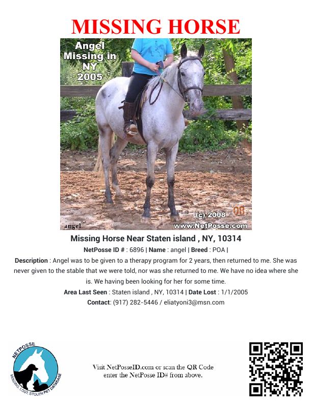 Description: Angel was to be given to a therapy program for 2 years, then returned to me. She was never given to the stable that we were told, nor was she returned to me. We have no idea where she is. We having been looking for her for some time.