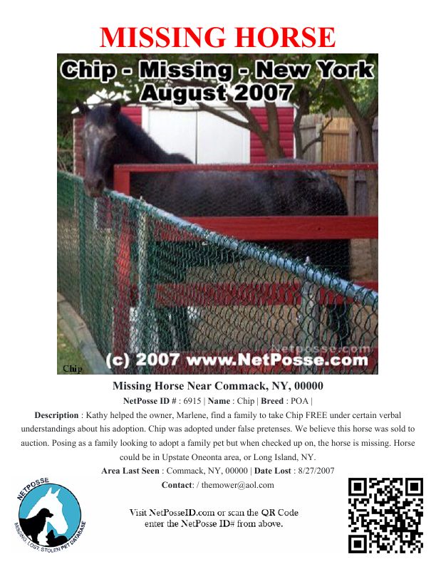 Description: Kathy helped the owner, Marlene, find a family to take Chip FREE under certain verbal understandings about his adoption. Chip was adopted under false pretenses. We believe this horse was sold to auction. Posing as a family looking to adopt a family pet but when checked up on, the horse is missing. Horse could be in Upstate Oneonta area, or Long Island, NY.