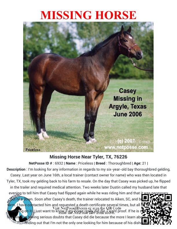 Description: I'm looking for any information in regards to my six-year-old bay thoroughbred gelding, Casey. Last year on June 16th, a local trainer (contact owner for name) who was then located in Tyler, TX, took my gelding back to his farm to resale. On the day that Casey was picked up, he flipped in the trailer and required medical attention. Two weeks later Dustin called my husband late that evening to tell him that Casey had flipped again while he was riding him and that it was necessary put him down. Soon after Casey's death, the trainer relocated to Aiken, SC, and built a new horse farm. I have contacted him and requested a death certificate several times, but all he says is that he is working on it. I just want to know if my horse really did die, I want proof. If he is still alive, I want to find him. I'm having serious doubts that Casey did die because the more I learn about the trainer, I'm finding out that I'm not the only one looking for him because of his dishonesty.