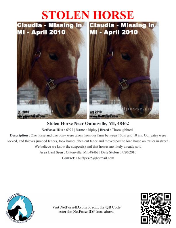 Description: One horse and one pony were taken from our farm between 10pm and 10 am. Our gates were locked, and thieves jumped fences, took horses, then cut fence and moved post to load horse on trailer in street. We believe we know the suspect(s) and that horses are likely already sold