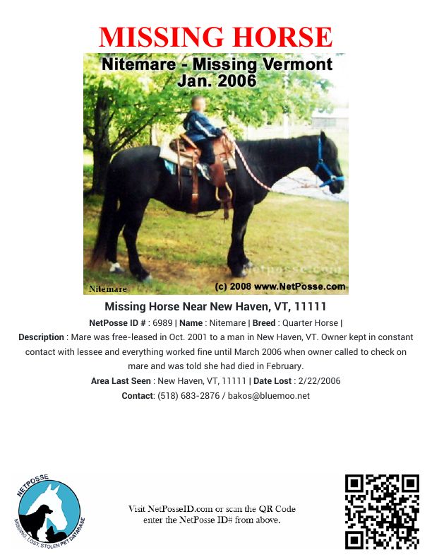Description: Mare was free-leased in Oct. 2001 to a man in New Haven, VT. Owner kept in constant contact with lessee and everything worked fine until March 2006 when owner called to check on mare and was told she had died in February.