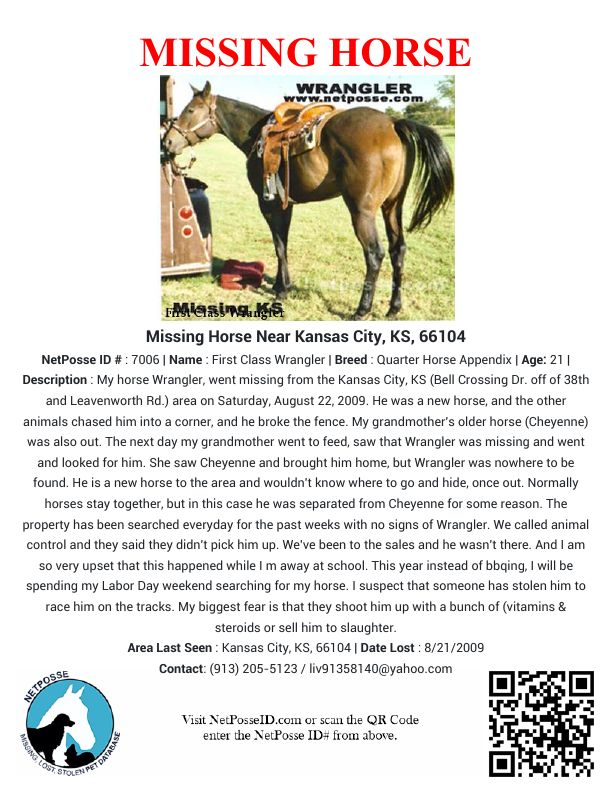 The property has been searched everyday for the past weeks with no signs of Wrangler. We called animal control and they said they didn't pick him up. We've been to the sales and he wasn't there. And I am so very upset that this happened while I m away at school. This year instead of bbqing, I will be spending my Labor Day weekend searching for my horse.