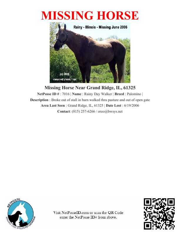 Description: Broke out of stall in barn walked thru pasture and out of open gate