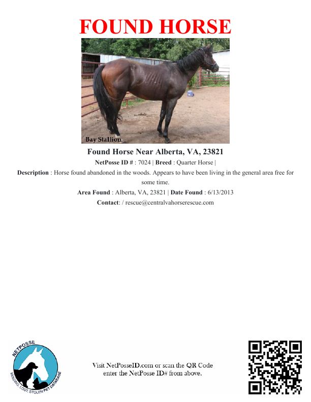 Description: Horse found abandoned in the woods. Appears to have been living in the general area free for some time.