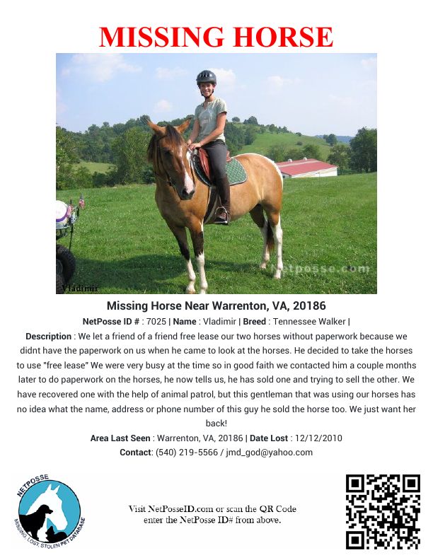 Description: We let a friend of a friend free lease our two horses without paperwork because we didnt have the paperwork on us when he came to look at the horses. He decided to take the horses to use "free lease" We were very busy at the time so in good faith we contacted him a couple months later to do paperwork on the horses, he now tells us, he has sold one and trying to sell the other. We have recovered one with the help of animal patrol, but this gentleman that was using our horses has no idea what the name, address or phone number of this guy he sold the horse too. We just want her back!