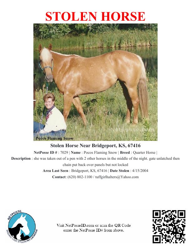 Description: she was taken out of a pen with 2 other horses in the middle of the night. gate unlatched then chain put back over panels but not locked
