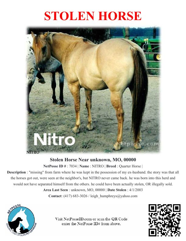 Description: Nitro was missing from farm where he was kept in the possession of my ex-husband. The story was that all the horses got out, were seen at the neighbor's, but NITRO never came back. He was born into this herd and would not have separated himself from the others. He could have been actually stolen, OR illegally sold. I do not know what happened to him but would still love to find out.