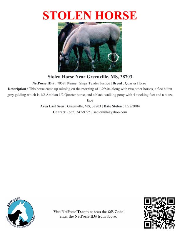 Description: This horse came up missing on the morning of 1-29-04 along with two other horses, a flee bitten grey gelding which is 1/2 Arabian 1/2 Quarter horse, and a black walking pony with 4 stocking feet and a blaze face