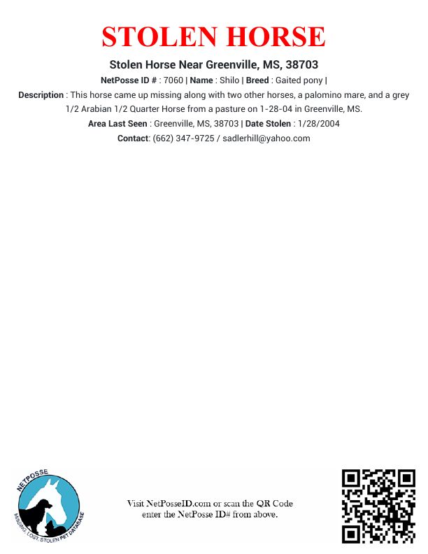 Description: This horse came up missing along with two other horses, a palomino mare, and a grey 1/2 Arabian 1/2 Quarter Horse from a pasture on 1-28-04 in Greenville, MS.