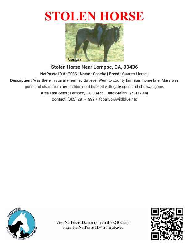 Description: Was there in corral when fed Sat eve. Went to county fair later; home late. Mare was gone and chain from her paddock not hooked with gate open and she was gone.