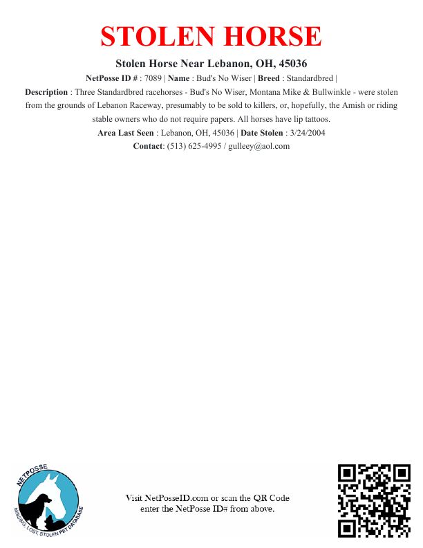 Description: Three Standardbred racehorses - Bud's No Wiser, Montana Mike & Bullwinkle - were stolen from the grounds of Lebanon Raceway, presumably to be sold to killers, or, hopefully, the Amish or riding stable owners who do not require papers. All horses have lip tattoos.