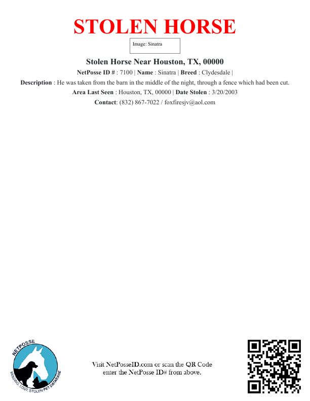 Description: He was taken from the barn in the middle of the night, through a fence which had been cut.