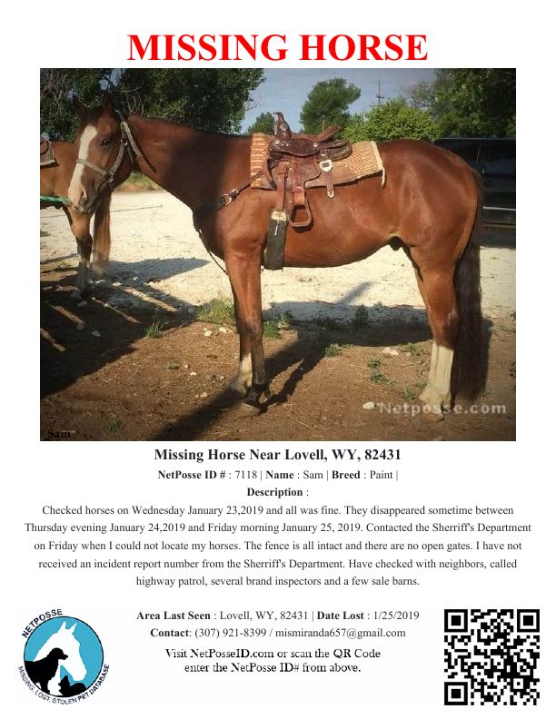 Description: Checked horses on Wednesday January 23,2019 and all was fine. They disappeared sometime between Thursday evening January 24,2019 and Friday morning January 25, 2019. Contacted the Sherriff's Department on Friday when I could not locate my horses. The fence is all intact and there are no open gates. I have not received an incident report number from the Sherriff's Department. Have checked with neighbors, called highway patrol, several brand inspectors and a few sale barns.