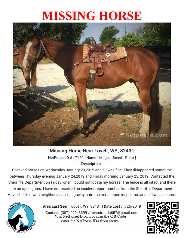 Description: Checked horses on Wednesday January 23,2019 and all was fine. They disappeared sometime between Thursday evening January 24,2019 and Friday morning January 25, 2019. Contacted the Sherriff's Department on Friday when I could not locate my horses. The fence is all intact and there are no open gates. I have not received an incident report number from the Sherriff's Department. Have checked with neighbors, called highway patrol, several brand inspectors and a few sale barns.
