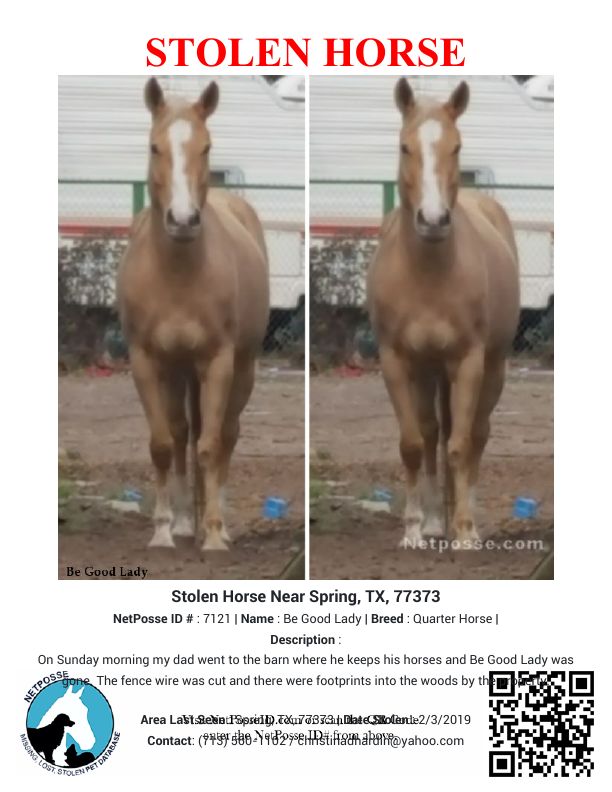 Description: On Sunday morning, my dad went to the barn where he keeps his horses, and Be Good Lady was gone. The fence wire was cut, and there were footprints in the woods by the property.