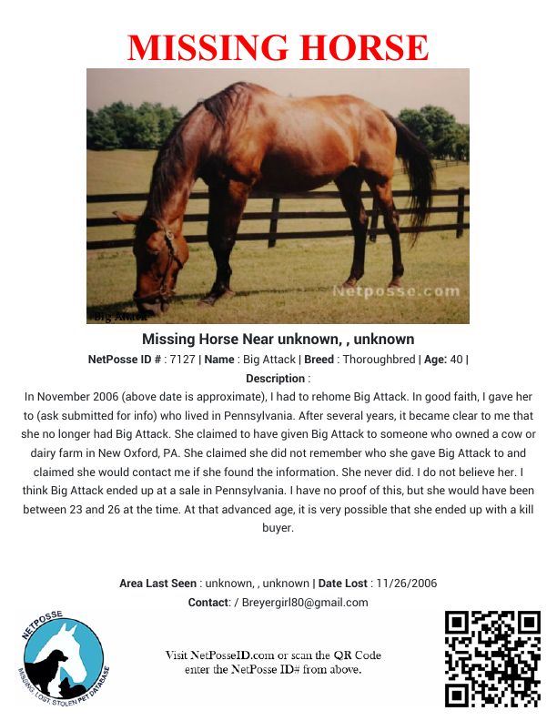 Description: In November 2006 (above date is approximate), I had to rehome Big Attack. In good faith, I gave her to (ask submitted for info) who lived in Pennsylvania. After several years, it became clear to me that she no longer had Big Attack. She claimed to have given Big Attack to someone who owned a cow or dairy farm in New Oxford, PA. She claimed she did not remember who she gave Big Attack to and claimed she would contact me if she found the information. She never did. I do not believe her. I think Big Attack ended up at a sale in Pennsylvania. I have no proof of this, but she would have been between 23 and 26 at the time. At that advanced age, it is very possible that she ended up with a kill buyer.