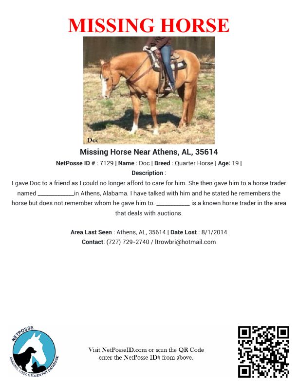 Description: I gave Doc to a friend as I could no longer afford to care for him. She then gave him to a horse trader named _____________in Athens, Alabama. I have talked with him and he stated he remembers the horse but does not remember whom he gave him to. ____________ is a known horse trader in the area that deals with auctions.
