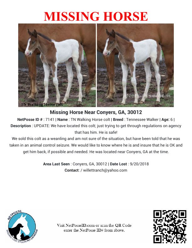 Description: UPDATE: We have located this colt; just trying to get through regulations on agency that has him. He is safe!We sold this colt as a weanling and am not sure of the situation, but have been told that he was taken in an animal control seizure. We would like to know where he is and insure that he is OK and get him back, if possible and needed. He was located near Conyers, GA at the time.
