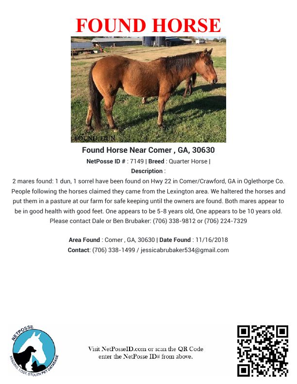 Description: 2 mares found: 1 dun, 1 sorrel have been found on Hwy 22 in Comer/Crawford, GA in Oglethorpe Co. People following the horses claimed they came from the Lexington area. We haltered the horses and put them in a pasture at our farm for safe keeping until the owners are found. Both mares appear to be in good health with good feet. One appears to be 5-8 years old, One appears to be 10 years old. Please contact Dale or Ben Brubaker: (706) 338-9812 or (706) 224-7329