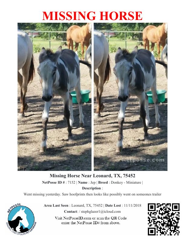 Description: Went missing yesterday. Saw hoofprints then looks like possibly went on someones trailer