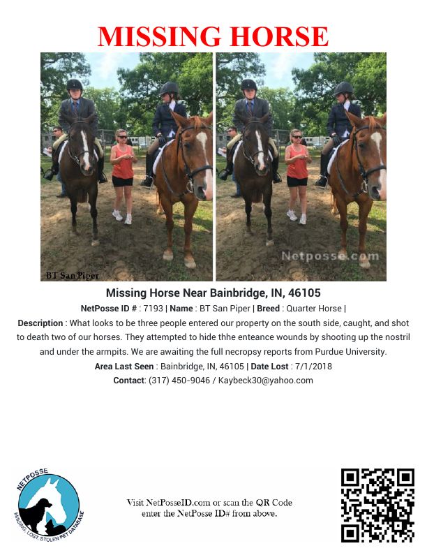 Description: What looks to be three people entered our property on the south side, caught, and shot to death two of our horses. They attempted to hide thhe enteance wounds by shooting up the nostril and under the armpits. We are awaiting the full necropsy reports from Purdue University.