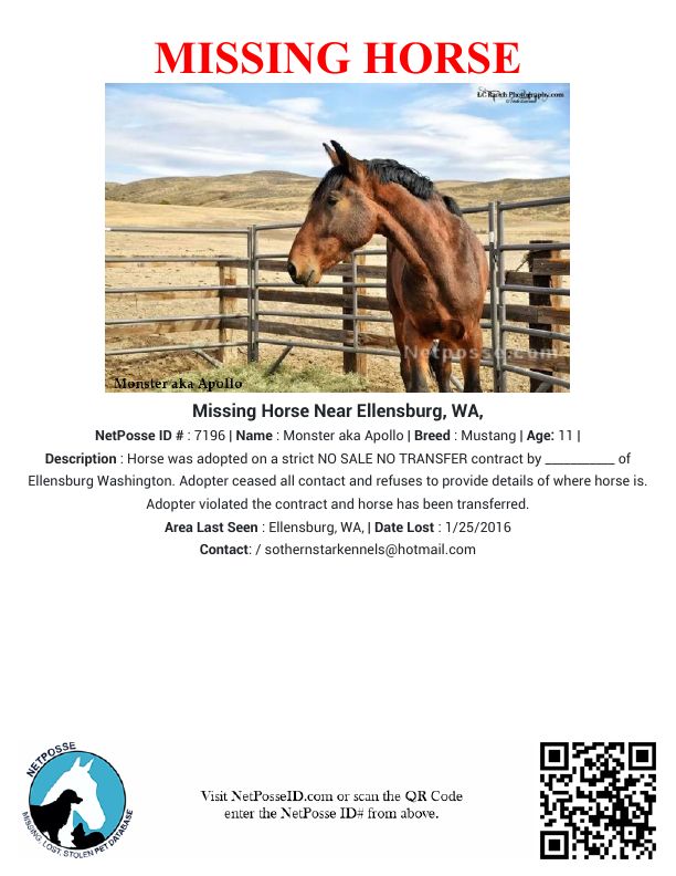 Description: Horse was adopted on a strict NO SALE NO TRANSFER contract by ___________ of Ellensburg Washington. Adopter ceased all contact and refuses to provide details of where horse is. Adopter violated the contract and horse has been transferred.
