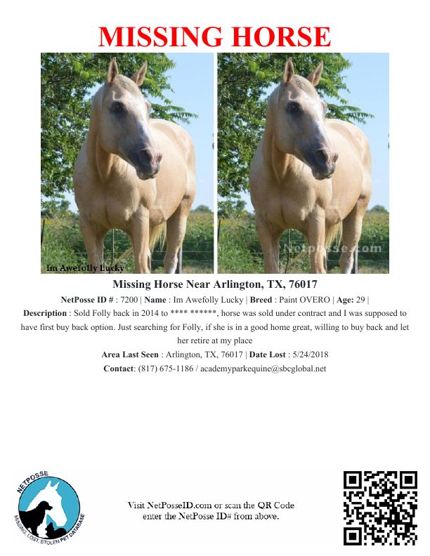 Description: Sold Folly back in 2014 to **** ******, horse was sold under contract and I was supposed to have first buy back option. Just searching for Folly, if she is in a good home great, willing to buy back and let her retire at my place