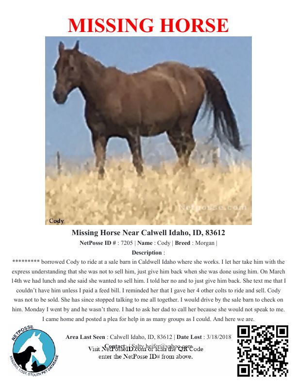Description: ********* borrowed Cody to ride at a sale barn in Caldwell Idaho where she works. I let her take him with the express understanding that she was not to sell him, just give him back when she was done using him. On March 14th we had lunch and she said she wanted to sell him. I told her no and to just give him back. She text me that I couldn’t have him unless I paid a feed bill. I reminded her that I gave her 4 other colts to ride and sell. Cody was not to be sold. She has since stopped talking to me all together. I would drive by the sale barn to check on him. Monday I went by and he wasn’t there. I had to ask her dad to call her because she would not speak to me. I came home and posted a plea for help in as many groups as I could. And here we are.