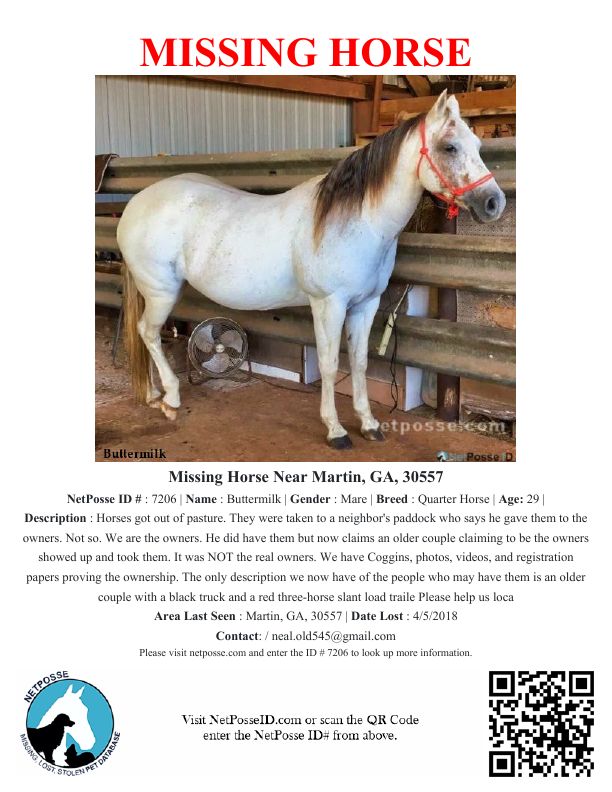 Missing Horse named Buttermilk - Martin, GA, 30557 #7206
