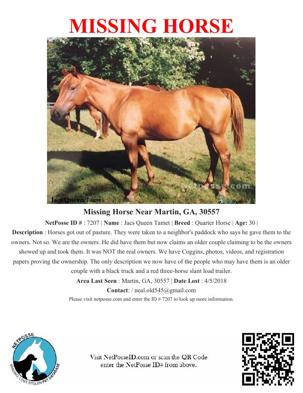 ON THIS DAY, NETPOSSE COLD CASE REVIEW. This report is still open in our NetPosse database on our website. You can read the details on this cold case and contact the owner by clicking on the image below. Could you please pass the cold case NetPosse Alert along as many times as you can? As many of you know, we've helped recover horses over a decade after they went missing. We never give up.