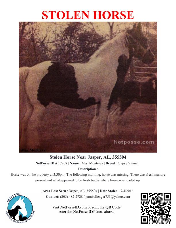 Description: Horse was on the property at 3:30pm. The following morning, horse was missing. There was fresh manure present and what appeared to be fresh tracks where horse was loaded up.