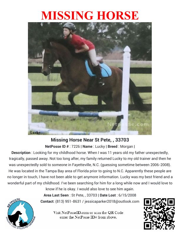 Description: Looking for my childhood horse. When I was 11 years old my father unexpectedly, tragically, passed away. Not too long after, my family returned Lucky to my old trainer and then he was unexpectedly sold to someone in Fayetteville, N.C. (guessing sometime between 2006-2008). He was located in the Tampa Bay area of Florida prior to going to N.C. Apparently these people are no longer in touch, I have not been able to get anymore information. Lucky was my best friend and a wonderful part of my childhood. I've been searching for him for a long while now and I would love to know if he is okay. I would also love to see him again.