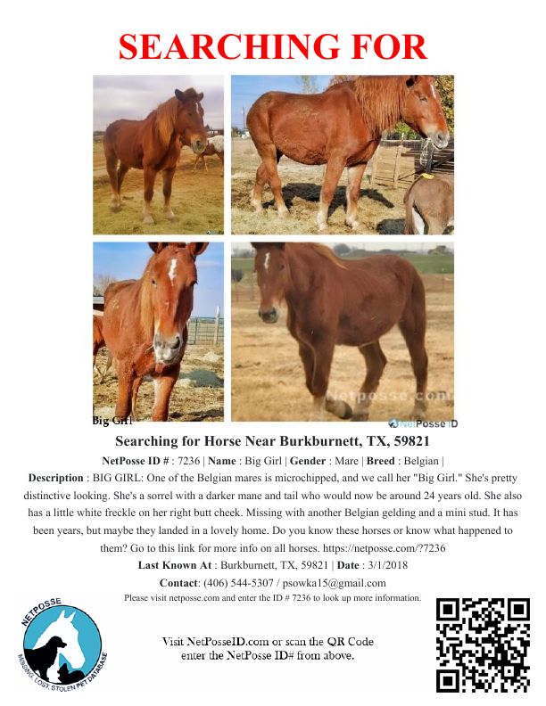 BIG GIRL: One of the Belgian mares is microchipped, and we call her "Big Girl." She's fairly distinctive looking. She's sorrel with a darker mane and tail. She also has a little white freckle on her right butt cheek. NetPosse Webpage Link https://netposse.com/?7236