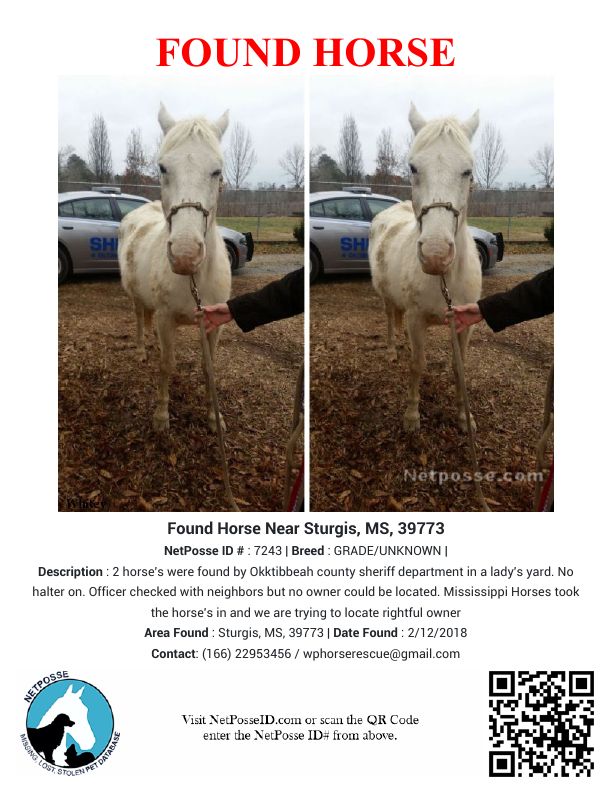 Description: 2 horse's were found by Okktibbeah county sheriff department in a lady's yard. No halter on. Officer checked with neighbors but no owner could be located. Mississippi Horses took the horse's in and we are trying to locate rightful owner