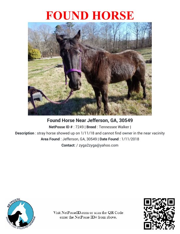 Description: stray horse showed up on 1/11/18 and cannot find owner in the near vacinity