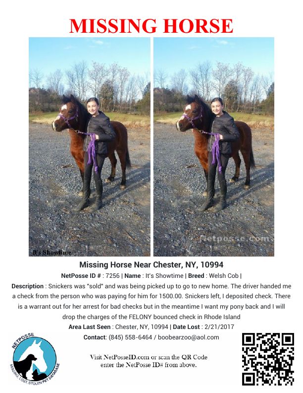 Description: Snickers was "sold" and was being picked up to go to new home. The driver handed me a check from the person who was paying for him for 1500.00. Snickers left, I deposited check. There is a warrant out for her arrest for bad checks but in the meantime I want my pony back and I will drop the charges of the FELONY bounced check in Rhode Island